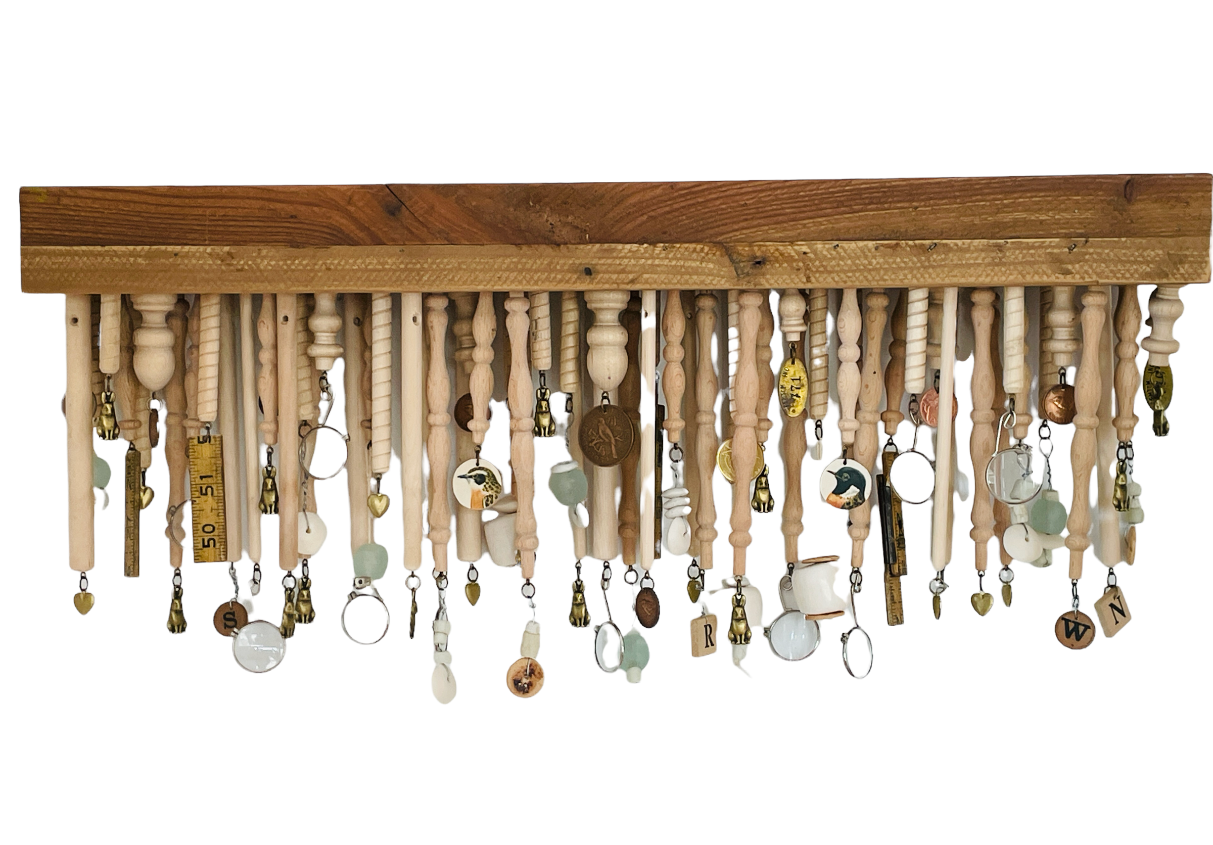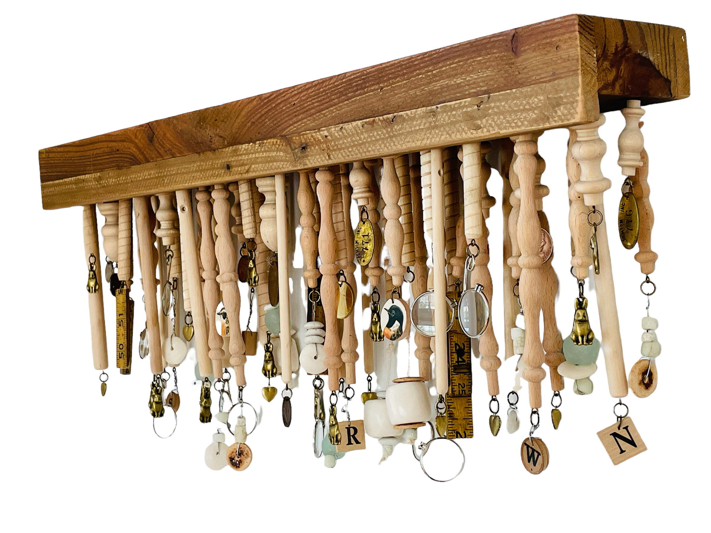Wood, paper, metal, glass, paper, latex and acrylic on wood